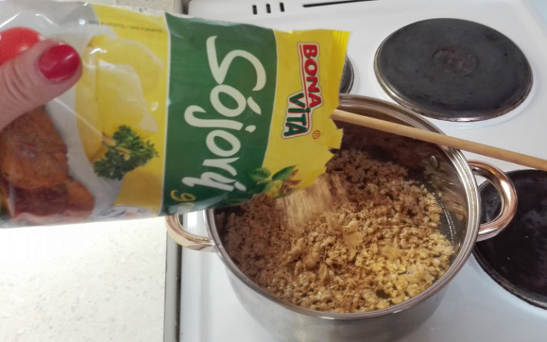 Sója je tak dobrým zdrojem bílkovin, že si díky ní vegetariáni velmi často nahrazují maso. V podstatě se dá říct, že malý sáček sóji obsahuje tolik bílkovin, kolik by jinak člověk snědl, jen kdyby spořádal 2 kg masa najednou. Já sice nejsem vegetarián, ale ráda si pokrmy ze sóji (v tomto případě ze sójového granulátu) zařadím do svého jídelníčku.