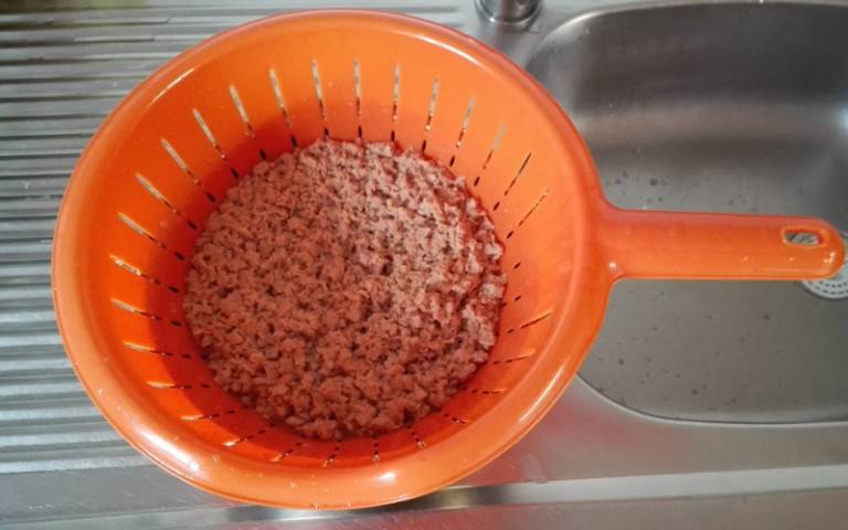 5. Připravíme si sítko a do něj nalijeme uvařený granulát. Necháme ho v něm dostatečně vykapat od přebytečné vody z vaření a zároveň vychladnout.
