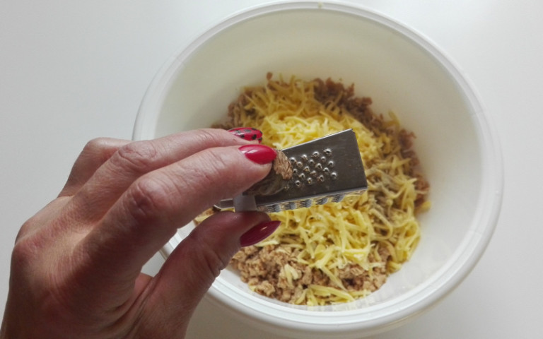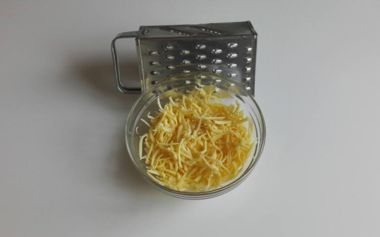 6. Než granulát vychladne, nastrouháme si sýr na struhadle s většími otvory, říkáme nastrouhat nahrubo.