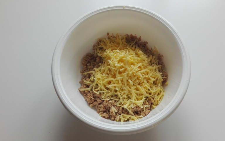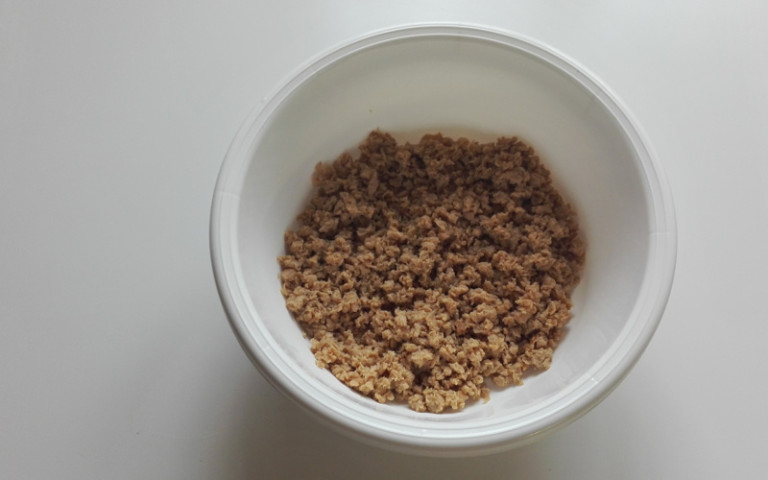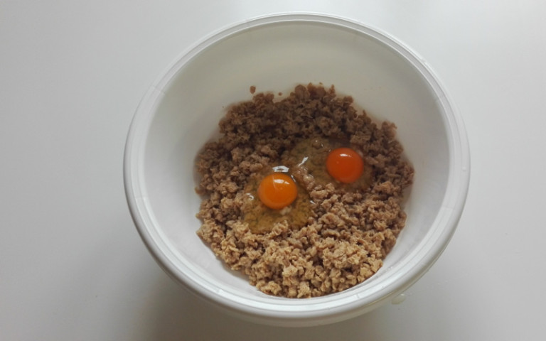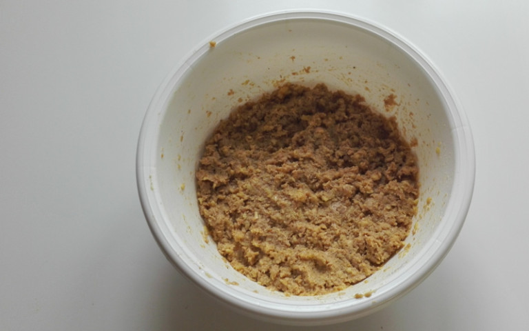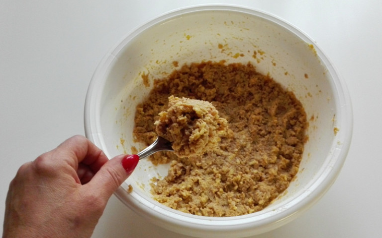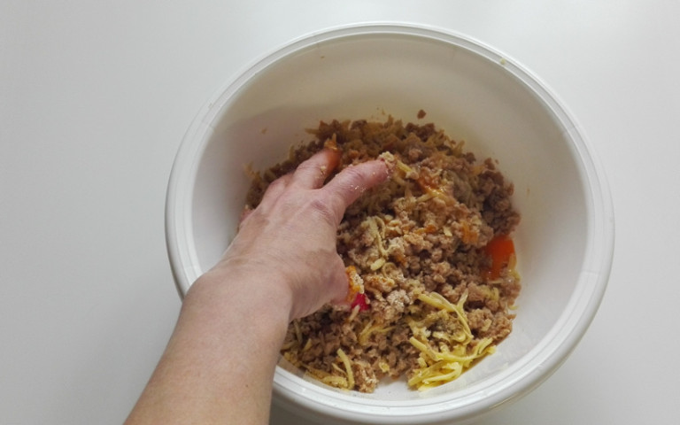 13. Vše dobře promícháme, nejlépe vlastní, umytou rukou. Nakonec ještě ochutnáme a popřípadě dosolíme. Ochutnat je nutné, protože chuť sójového granulátu je nevýrazná, a každá kuchyňská sůl solí jinak.