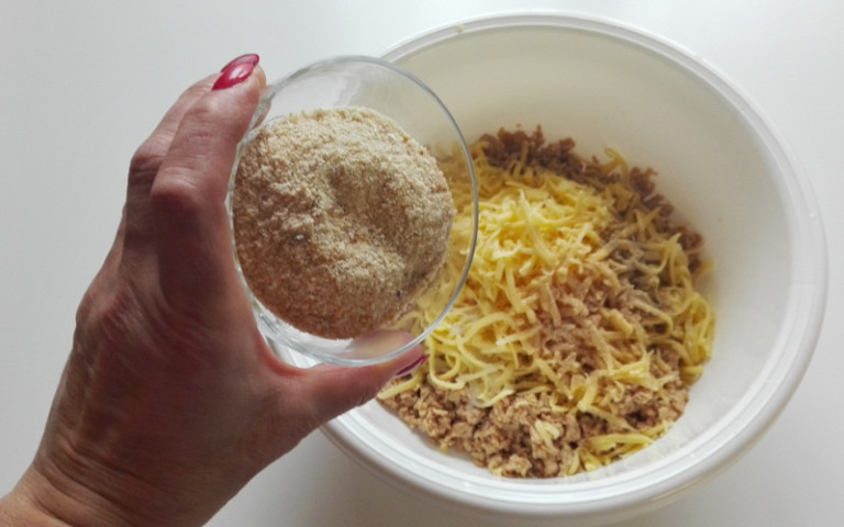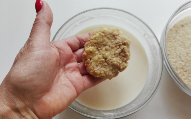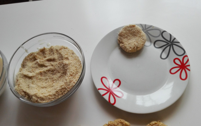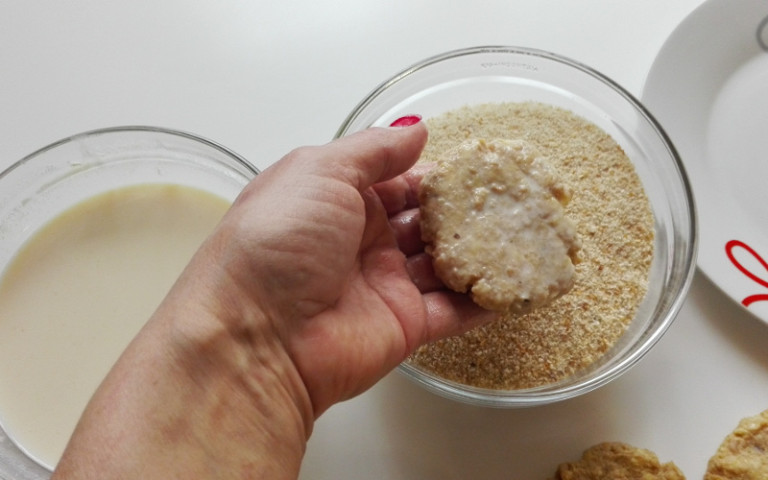 29. Takto namočenou placičku ihned přeneseme rukou do strouhanky.