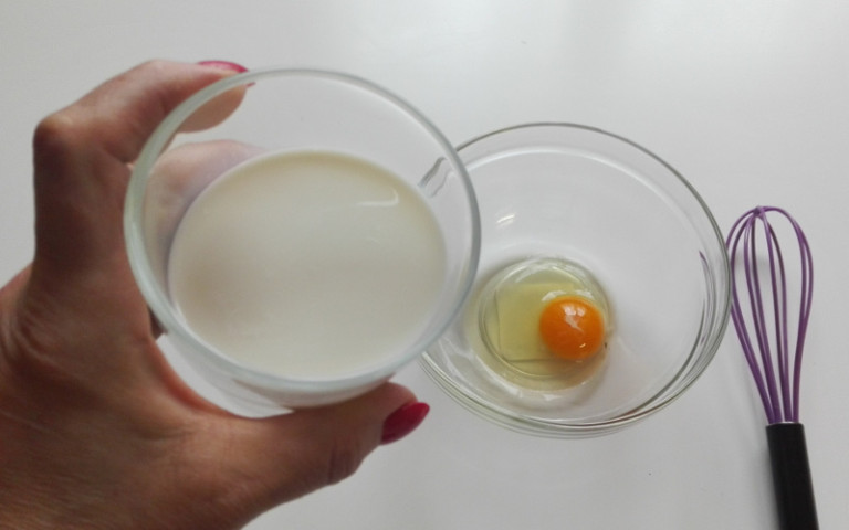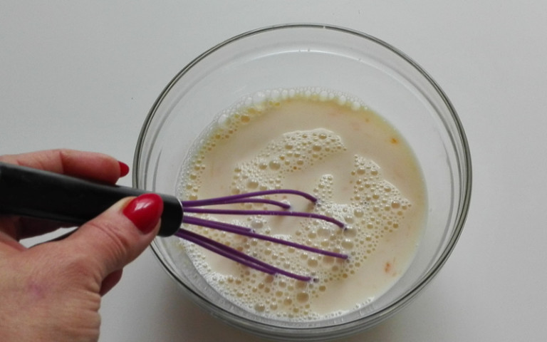 19. Vznikne nám řidší těstíčko. Tento postup nám ušetří čas i nádobí, protože klasický trojobal jsou rozšlehaná vejce s mlékem, v druhé míse mouka a ve třetí strouhanka. My budeme mít jen misky dvě, na těstíčko a na strouhanku.
