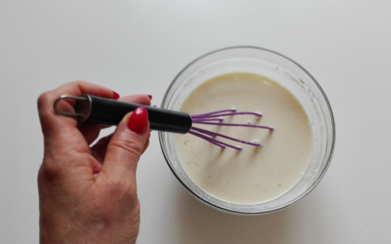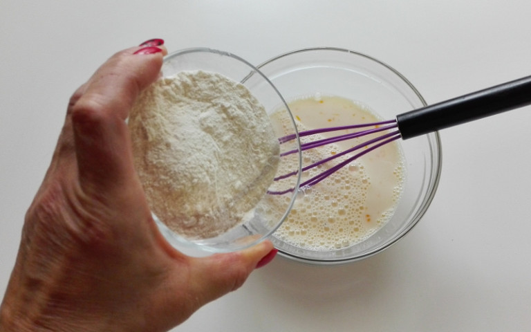 18. Přisypeme hladkou mouku a šleháme metličkou dál.