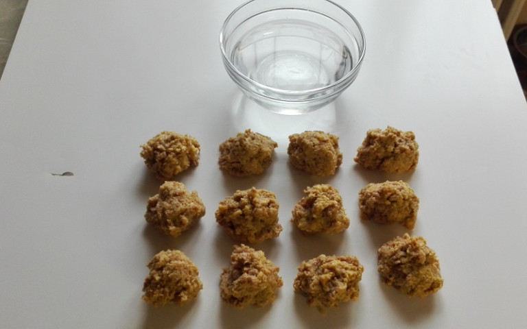 21. Všechny hrudky si dáme vedle sebe na podložku nebo prkénko či talíř. Hrudky tvoříme jen o něco menší, než je tenisový míček.